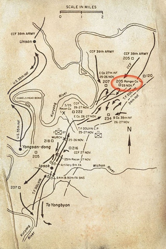With orders to seize and defend Hill 205, the Rangers moved out in the early morning hours of November 25, in temperatures that dropped below zero. As Puckett’s men approached the hill, Chinese mortars began to bracket their positions. Calling in their own artillery, air strikes, and tank direct fire support to break up the enemy attack, the Rangers suddenly found themselves exposed, their nearest friendly unit having fallen back several kilometers behind them. Puckett recalled, “I felt all alone, but totally focused on my direct responsibilities and prepared to hold the high ground.” Digging in, the Rangers primed themselves for the worst, which soon came. At that very place and time, the Chinese Communist Forces (CCF) began their all-out assault of American positions all along the lines. Surprised and overwhelmed, UN forces began retreating across the front. However, the Rangers held their ground, even improving their positions throughout the rest of the day.